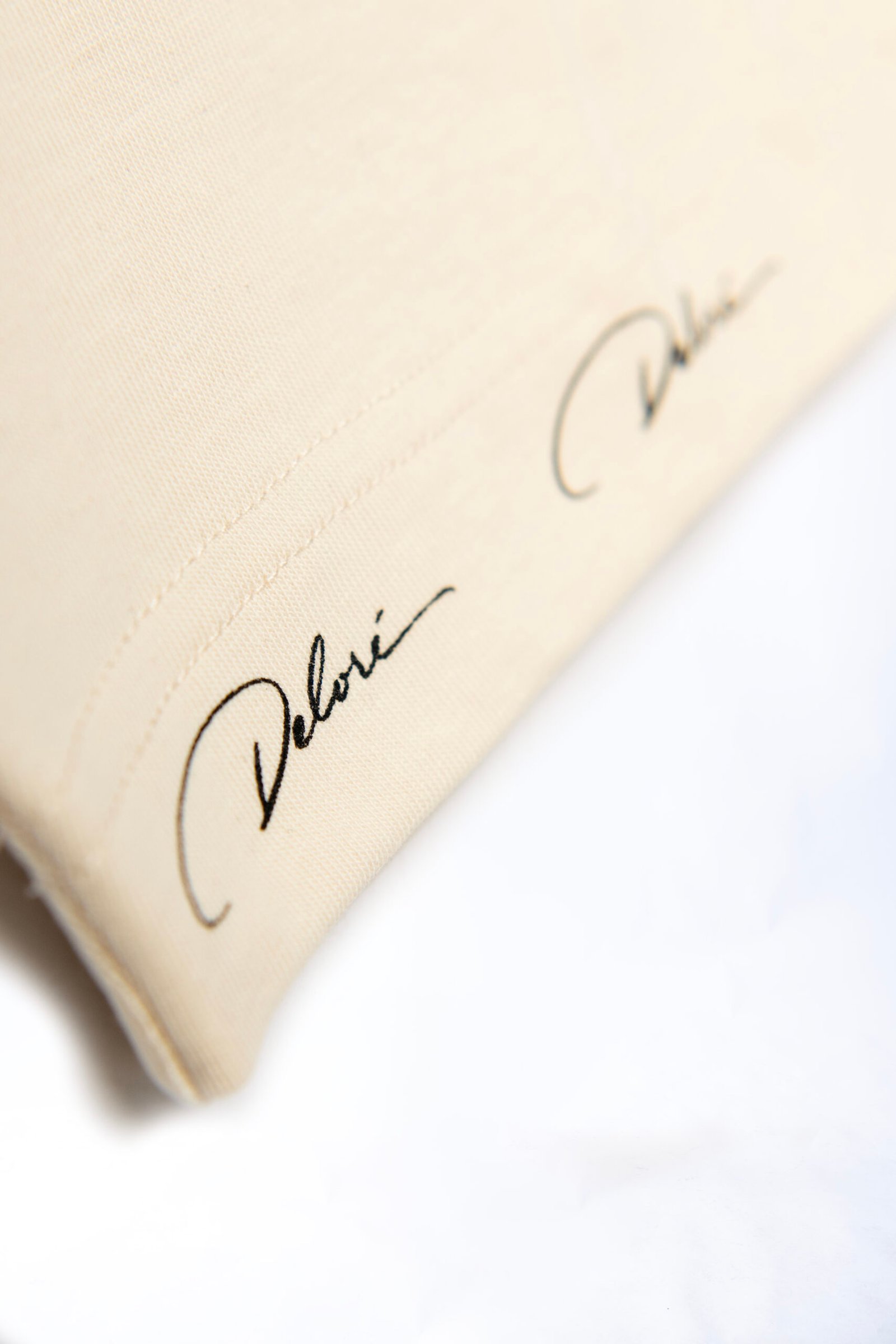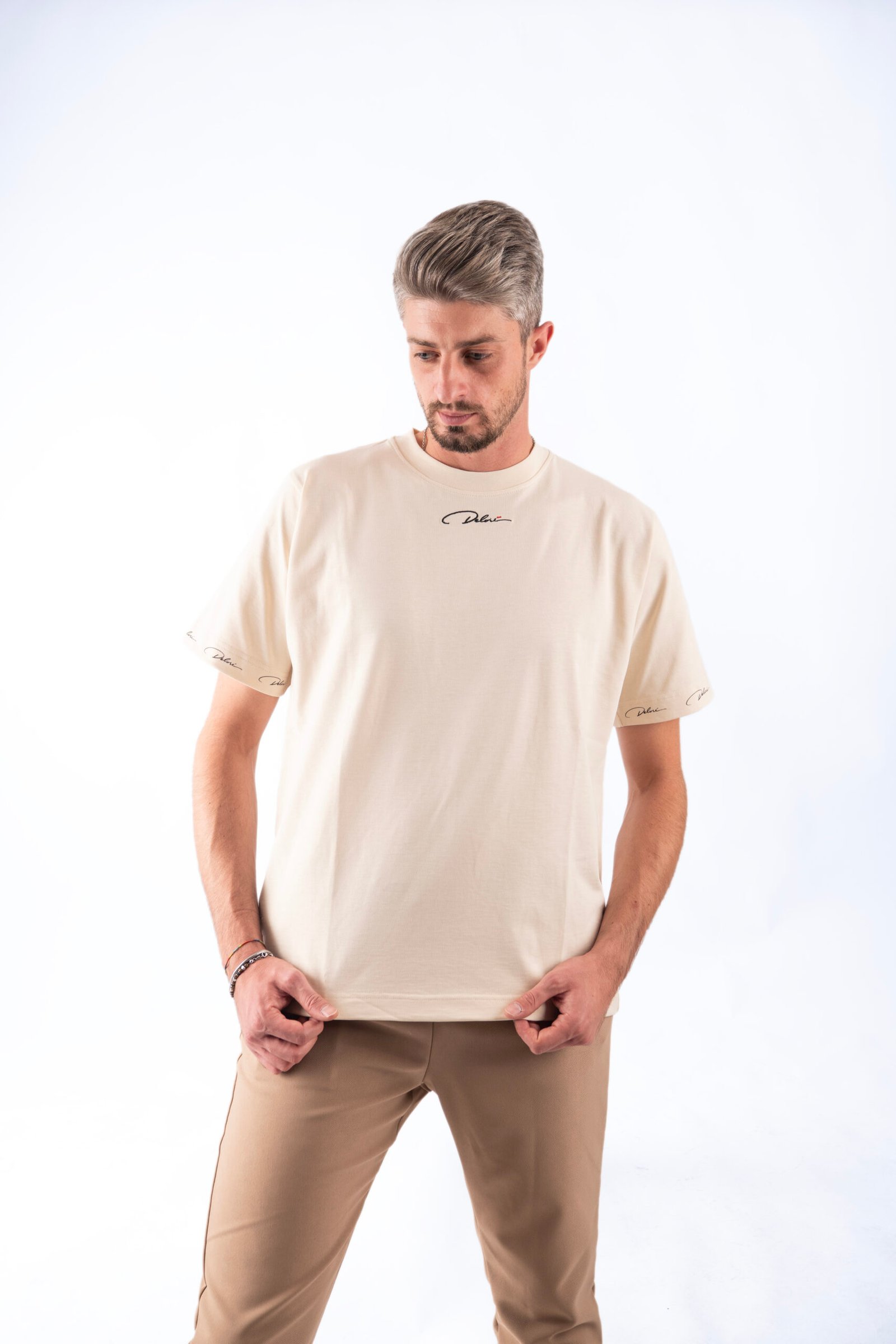 L’essenza del lusso contemporaneo in una t-shirt. Realizzata in morbidissimo cotone beige, è impreziosita dal logo Deloré ricamato e da un’iconica sequenza di loghi sulle maniche. La perfetta fusione di comfort e design distintivo.