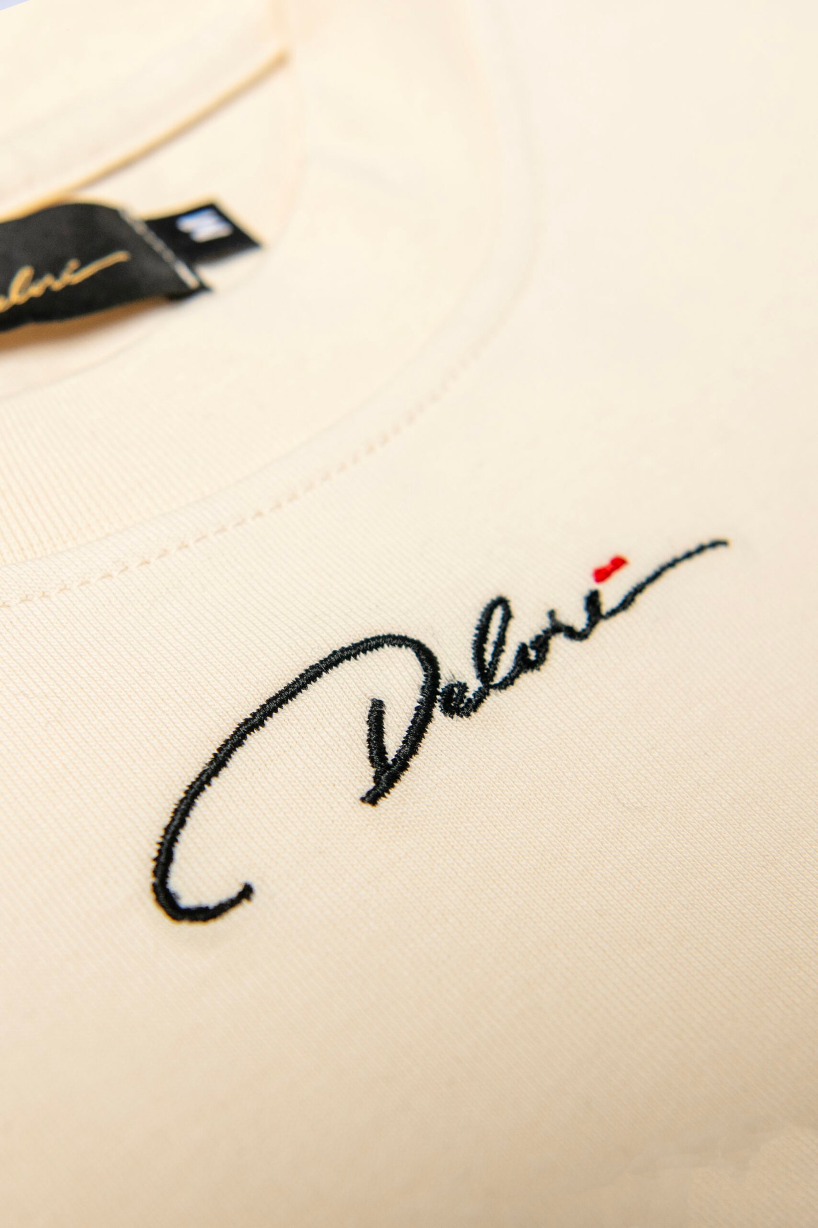 Il design è un perfetto equilibrio tra minimalismo e riconoscibilità. Al centro del petto, il logo Deloré è finemente ricamato, un sigillo di appartenenza che parla di artigianalità e cura del dettaglio. A rendere questo capo un’icona di stile è l’esclusiva decorazione sulle maniche: una sequenza ritmica di sei loghi ricamati che avvolgono il giromanica, creando un motivo grafico distintivo e un punto di luce che cattura lo sguardo. Questo dettaglio non è solo un ornamento, ma la firma di un’estetica ricercata, che trasforma la semplicità in un’affermazione di stile.